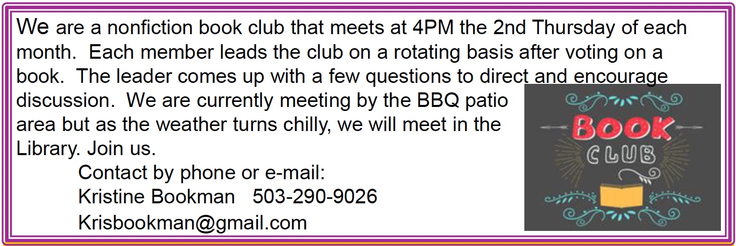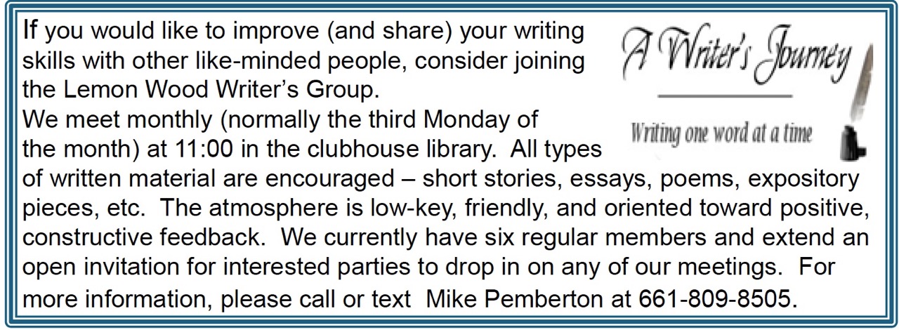 Meets at 11 am on the third Monday of each month, in the Clubhouse library. For more information please call or text Mike Pemberton at 661-809-8505.