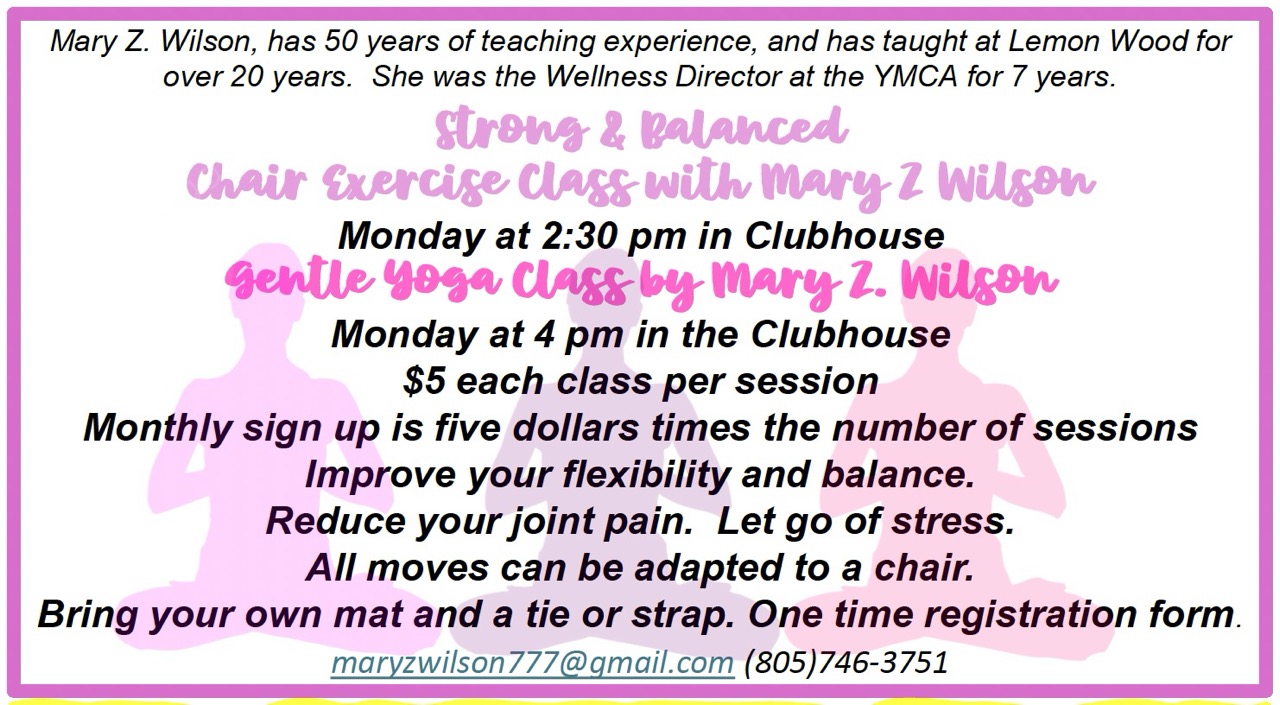 Every Monday at 2:30 pm in the Clubhouse • $5 per session • Bring your own mat and a tie or strap. Contact: Mary Z. Wilson at (805)746-3751 or [email protected]